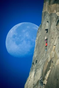 Evans, well-acquainted with the rock’s many climbing routes, knew exactly when and where climbers would emerge, allowing him to capture this shot just as the moon aligned perfectly behind them.
