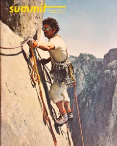 In earlier years, Evans was the camera subject on El Capitan instead of the photographer. His own ascents on El Cap have been featured in climbing magazines, such as this one from 1985.