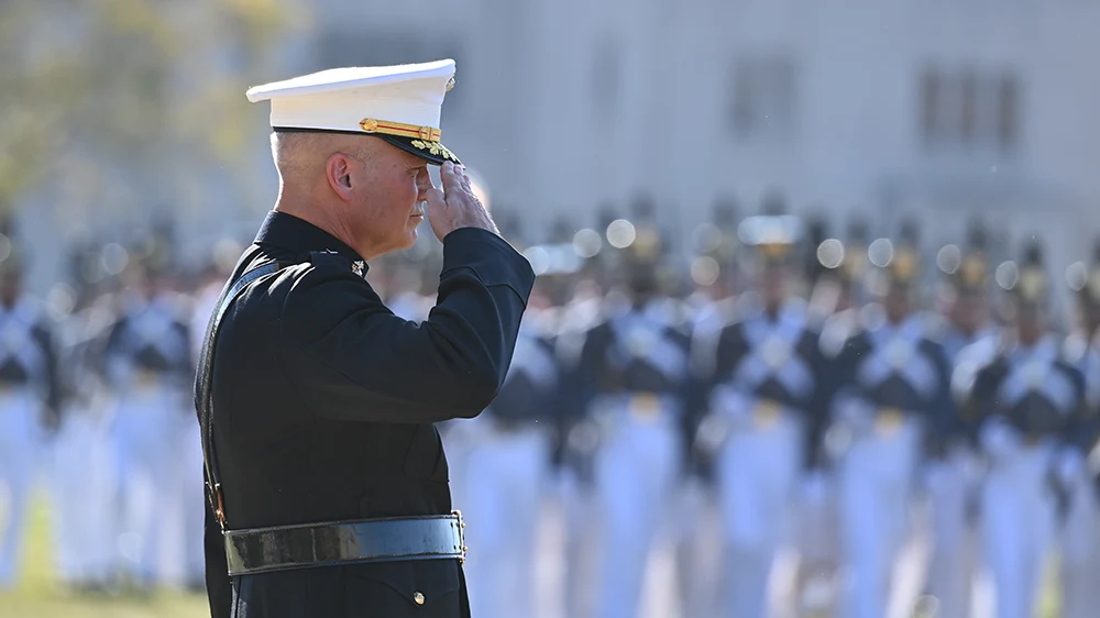 Williams takes review of the Founders Day Parade with Lt. Gen. David Furness ’87, VMI superintendent.